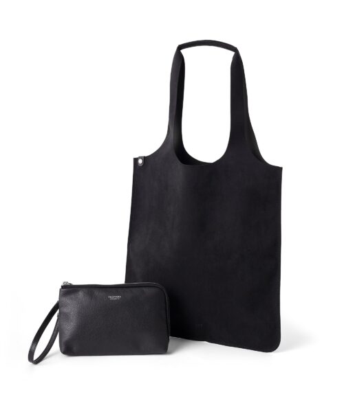 植物由来の再生資源を使用したウルトラスエードのトートバッグとレザーポーチがセットになったFUJITAKA トラバースシリーズ。折りたたむことで付属のポーチに収納可能なパッカブルトート仕様です。トートバッグはA4ファイル収納に対応したサイズで、日常的な荷物を入れて持ち歩くことができます。