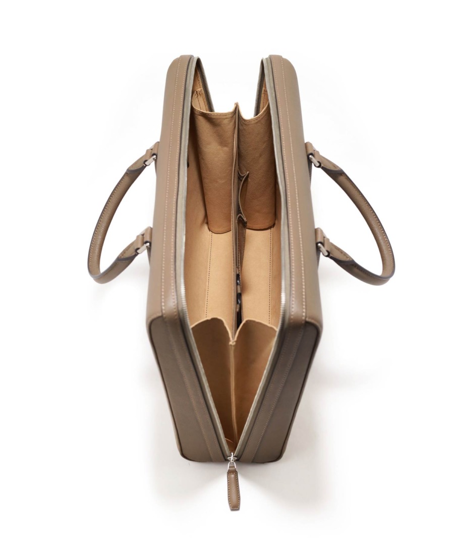 特殊なマチ構造は一般的な平ミシンや、横からアームが出ている腕ミシンではなく、ポストミシンと呼ばれる、底から縦に棒状のアームが突き出た特殊なミシンを使い、日本でもトップクラスの職人が、高度な技術を駆使して通常のミシンでは縫製する事が不可能な3次元的な立体縫製で仕立てています。