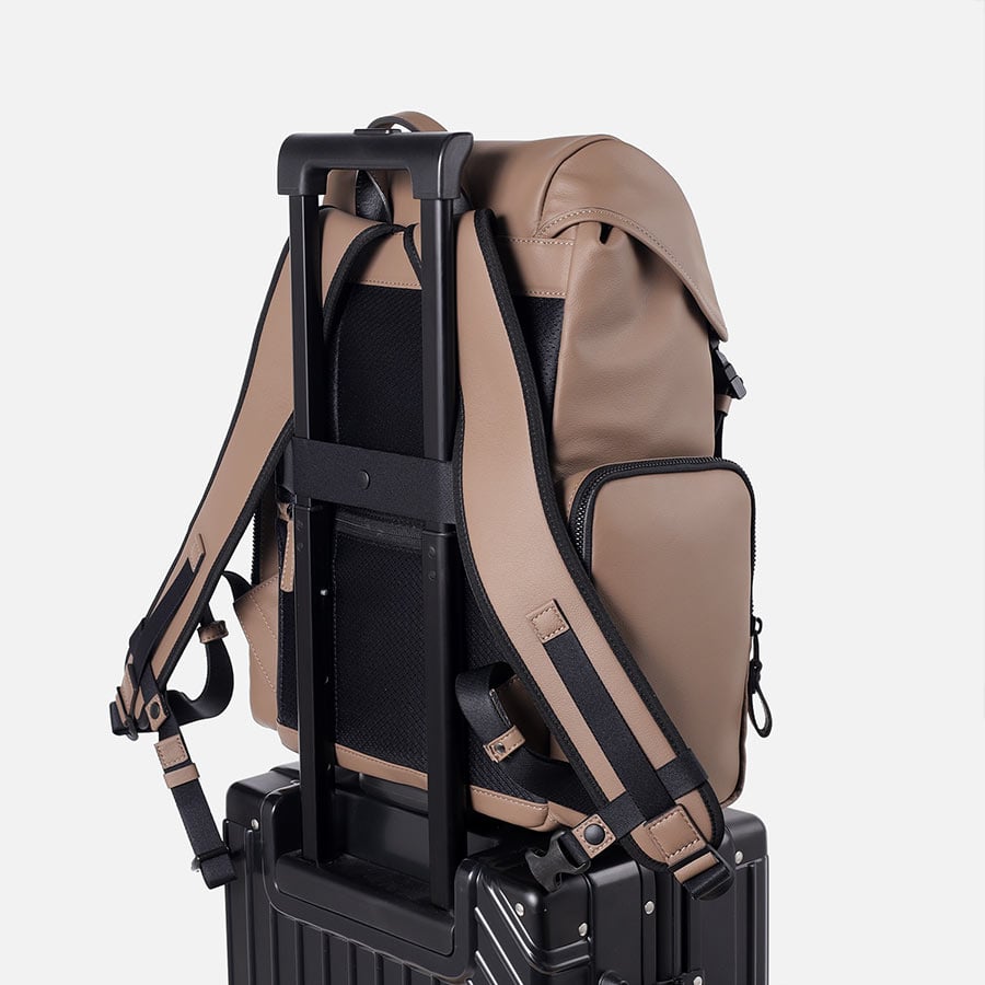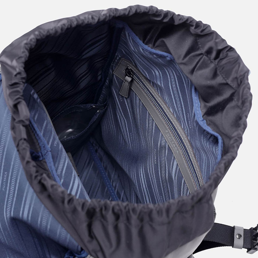 メインコンパートメントへのアクセスは使いやすい巾着式です。A4ファイル、13インチPCやペットボトル、雑誌等が収納できる大容量のリュックです。背側にはセットアップベルトがあり、スーツケースに取り付けることができます。
